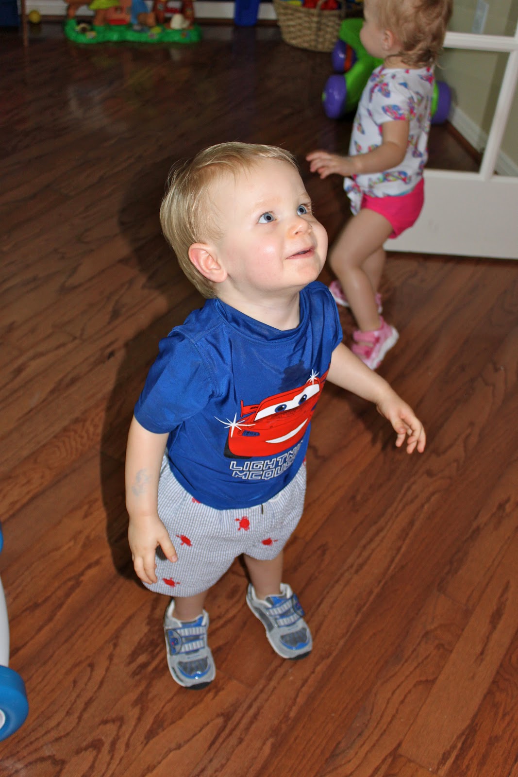 Really fun stuff: The kids are so sweet and generous with hugs and kisses now. They spontaneously give each other a hug at least once a day. They give their grandparents kisses by licking the iPad screen on Skype. At bedtime we stand at their doorways (side by side) and they give each parent a kiss and then give each other a kiss goodnight. They love music, particularly 80s music, and enjoy having 80s dance parties in the afternoons. They can now "ask" for something they want, sometimes pretty specifically. Brady brought me Little Blue Truck to read the other day and said "Beep Beep" to get me to read it to him. Chloe brought me Yummy Yucky to read and said "Umm Eeeee" (Yummy). They really understand and know a lot of things, even if they can't say the word, they do know what the object is since they can correctly point to many objects, shapes, and animals in a book or in real life if I ask them too. Their smiles and laughs are the highlights of my day. They are great babies and I am so proud of them all the time.